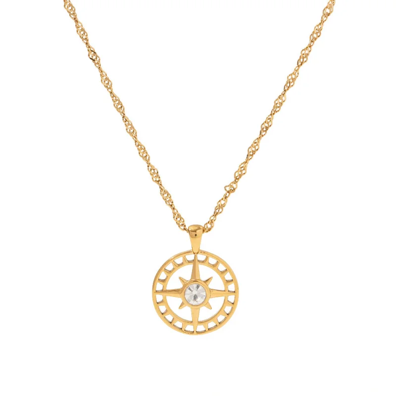 Embrace mystique with this Tarot-inspired necklace. A circular pendant adorned with a star-shaped center diamond. Crafted from waterproof, fade-resistant stainless steel in lustrous gold. Hypoallergenic, nickel, lead, and cadmium-free.