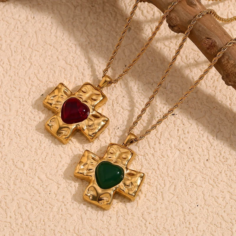 This vintage-inspired cross pendant necklace features a stunning gem heart center, crafted from stainless steel and plated with 18k gold. It's a timeless piece perfect for any occasion.